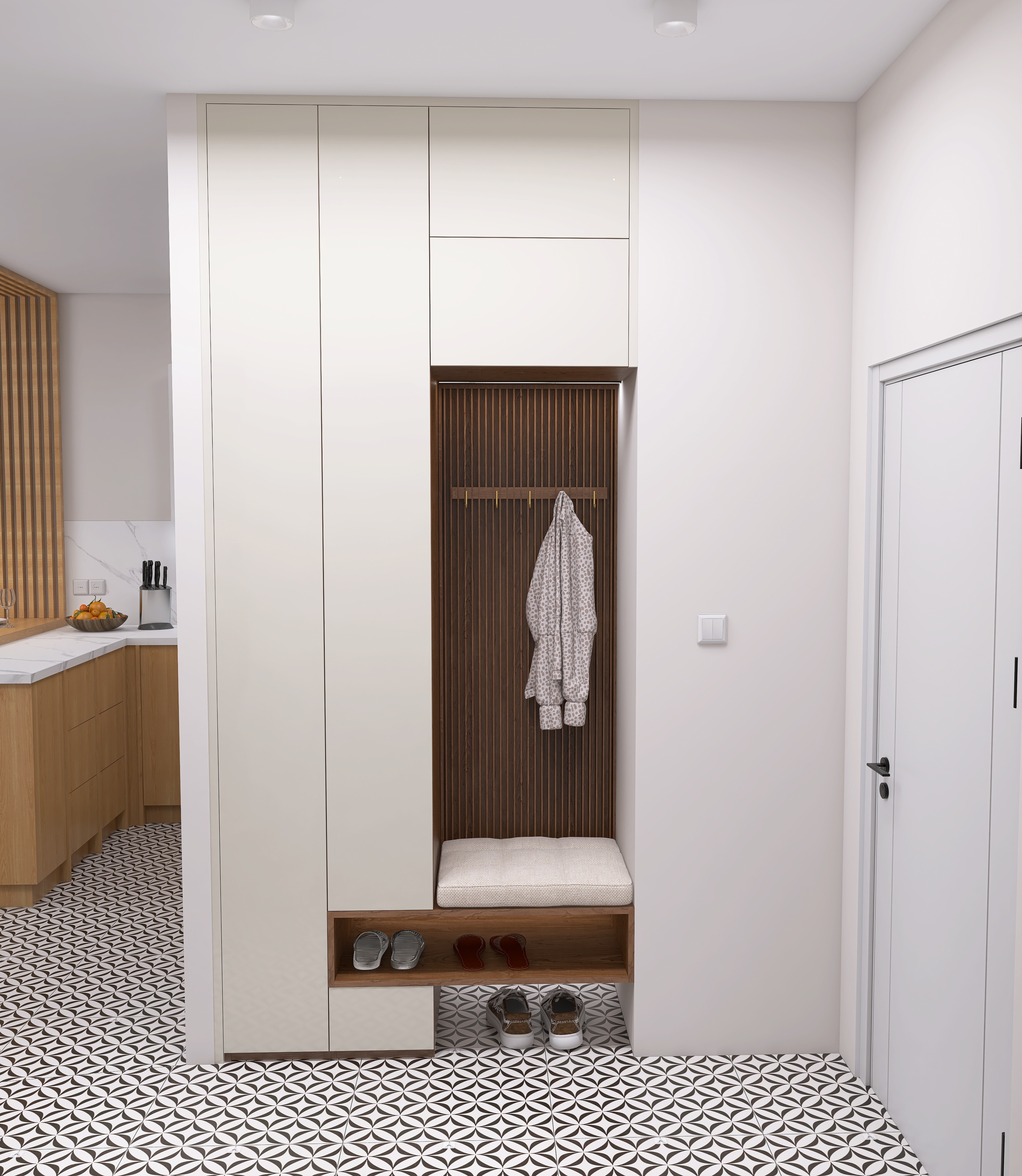 The hallway serves as a representative introduction to the apartment and creates a sense of harmony and warmth from the very first step.