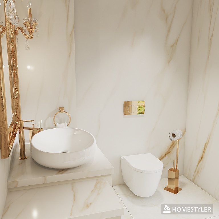 Przestrzeń, w której użyłem marmur, złoto i kryształowy żyrandol co pomogło uzyskać harmonię luksusu. To przestrzeń, w której codzienność zamienia się w rytuał, a każdy detal – od uchwytów po ramy luster – opowiada historię o pięknie i harmonii.