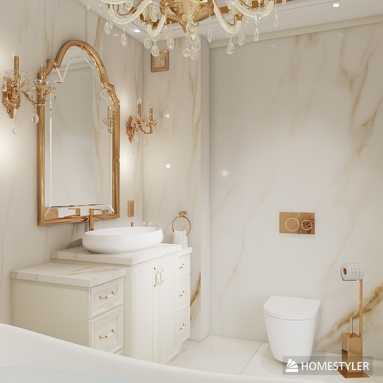 To wnętrze to połączenie klasyki i luksusowych akcentów. Centralnym punktem jest wolnostojąca wanna na złotych, rzeźbionych nogach, której nie mogłem tu nie umieścić. Tuż obok niej szafka ze zdobieniami i marmurowym blatem oraz umywalką nablatową o idealnie zaokrąglonym kształcie, która dodaje przestrzeni lekkości, a całości dopełniłem złotą armaturą, dekoracyjnymi kinkietami i kryształowym żyrandolem. Marmurowe wykończenia ścian w połączeniu ze złotymi ramami tworzą niepowtarzalny klimat luksusu i elegancji.